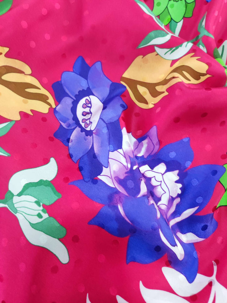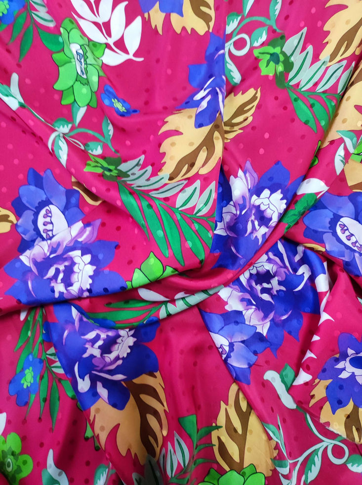 Луксозен копринен плат с висока плътност и сатенен блясък, тежко падаща естествена коприна със сатен от вътрешната страна. Лицето е мат, на дискретни сатенени точки. Цветовете са на цикламен фон сини и зелени цветя