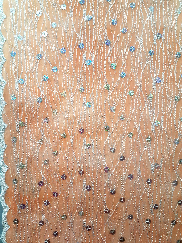 Пастелна коприна креп де шин,в нежен прасковен цвят. Коприната завършва с край.Тя е с паети и сребриста нишка от ламе.