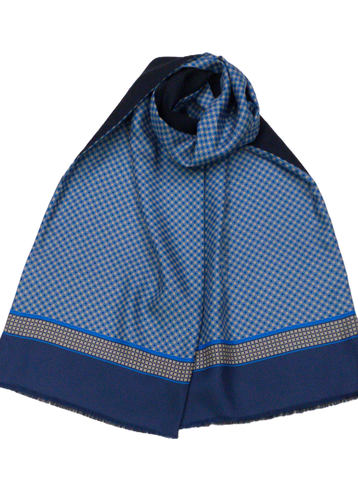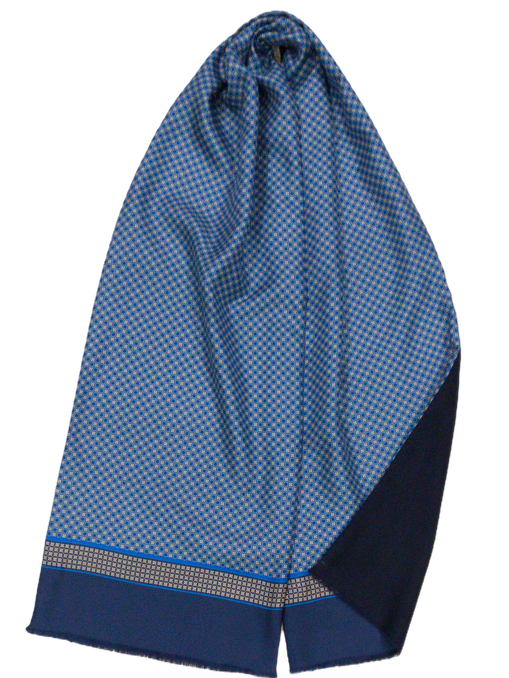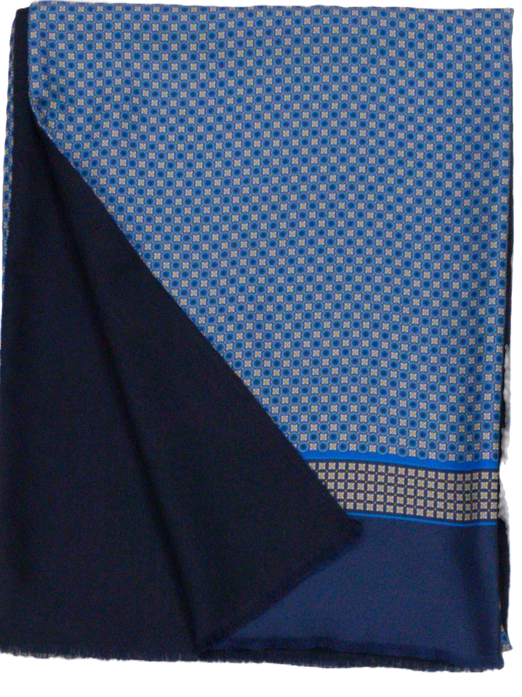 Италиански шал с размер 160/33 см, 50% вълна, 50% коприна. Едното лице е на син фон кръгчета и цветенца в бяло, жълто и тъмно синьо, другото лице е тъмно синьо. Ефектен и елегантен аксесоар подходящ за всяка дреха.