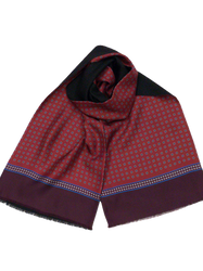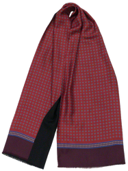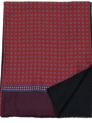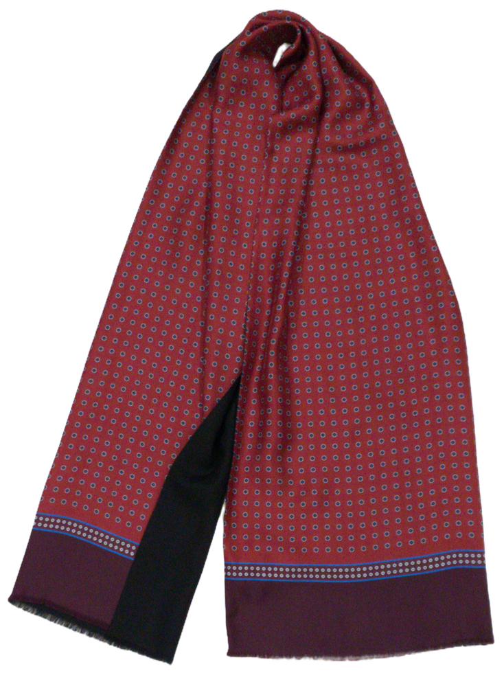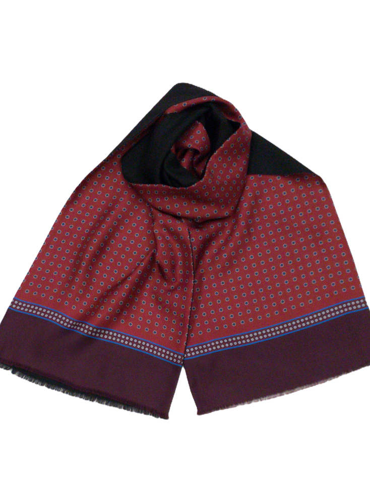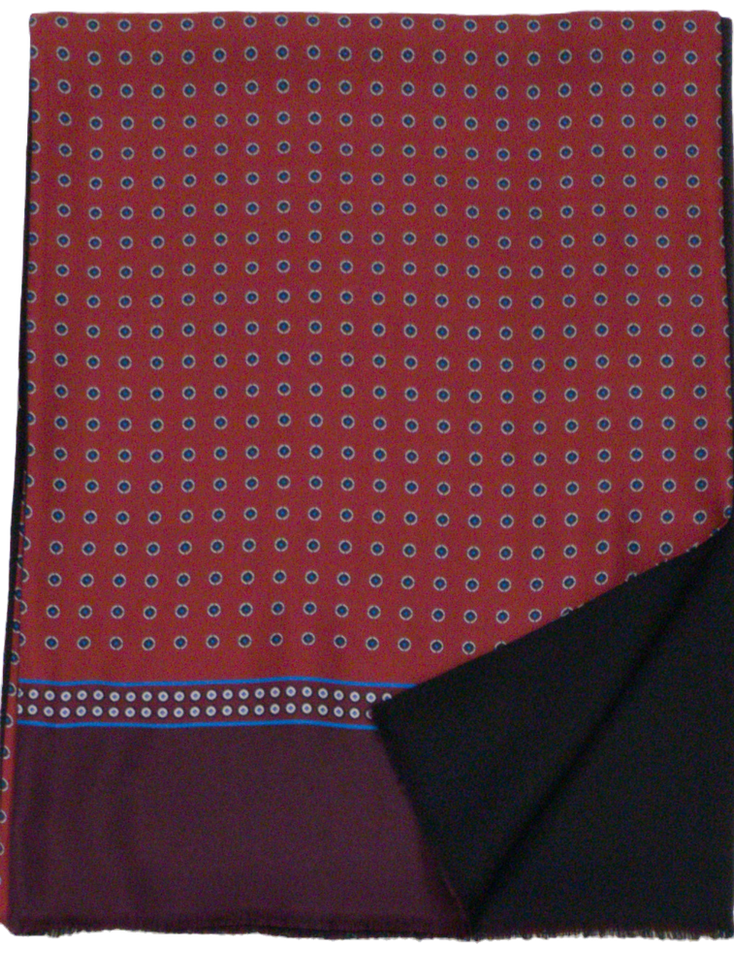 Италиански двулицев шал с размер 160/33 см, 100% вълна, 100% коприна. Едното лице е на тъмно червен фон кръгчета в черно, синьо и екрю, завършващ с бордо бордюр, другото лице вълненото е черно. Ефектен и елегантен аксесоар подходящ за всяка дреха.
