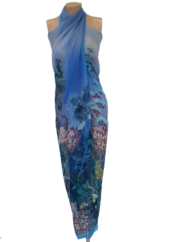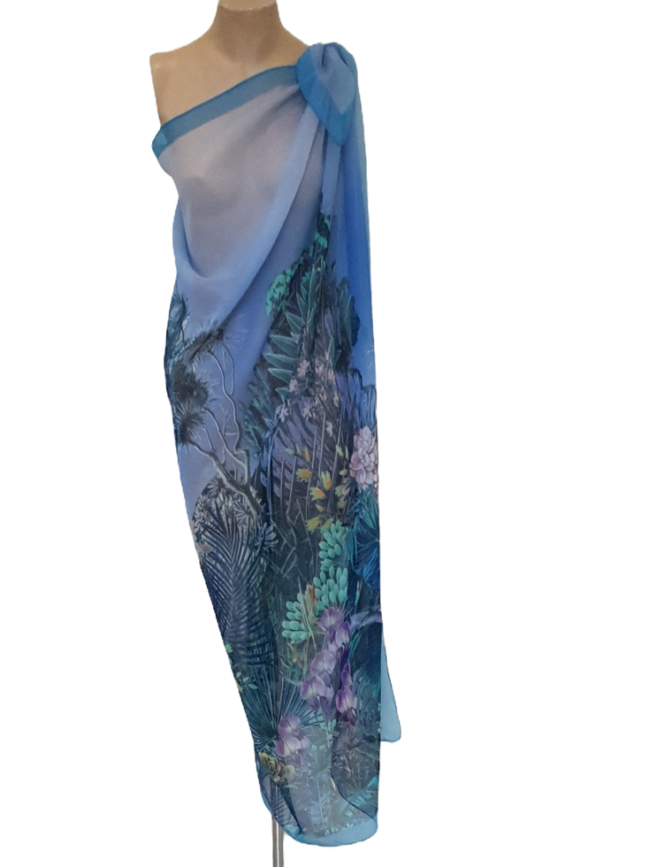 Италиански шал 100% копринен шифон, с размер 140/140 см. Елегантен, лек, ефирен, подходящ за всяка дреха, може да се носи и като парео. Десенът е флорален в нюанси на синьо, жълто, розово, зелено, бордо, лилаво, бежово, екрю.