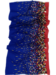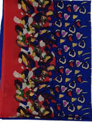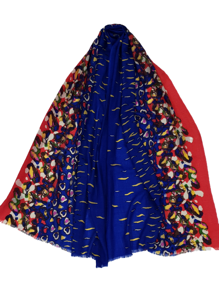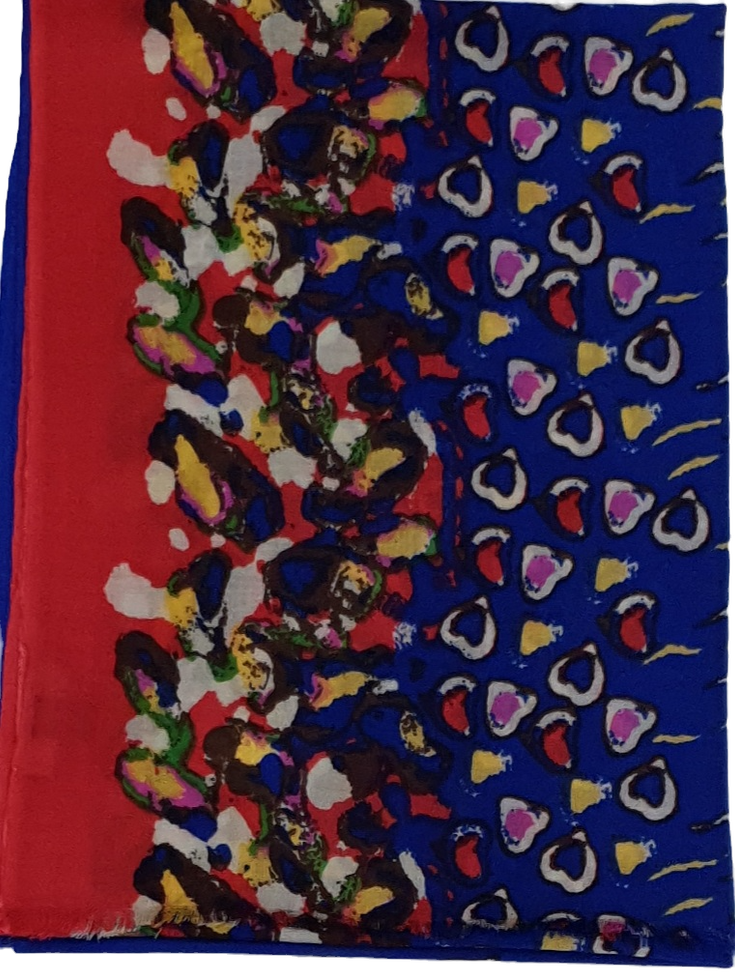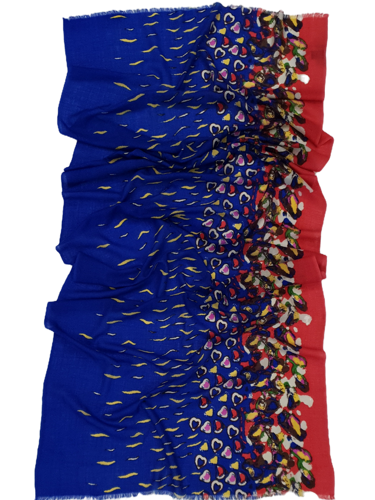 Италиански шал 30% кашмир, 70% вълна с размер 200/70 см. Абстрактен десен на сърчица и вълнички в синьо, червено, жълто, екрю, розово,кафяво и зелено. Ефирен мек и топъл шал, подходящ за всяка дреха.