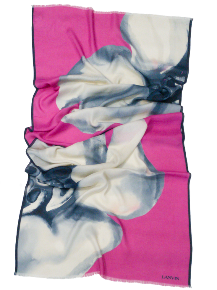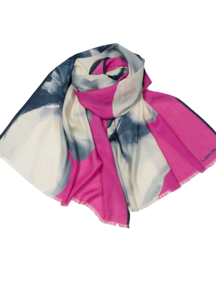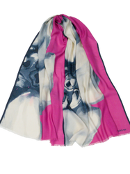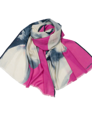 Италиански шал 90% модал,10% кашмир с размер 70/175см. Десенът е абстрактен в розово, екрю, синьо и сиво. Елегантен, мек и ефектен шал, подходящ за всяка дреха.
