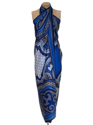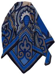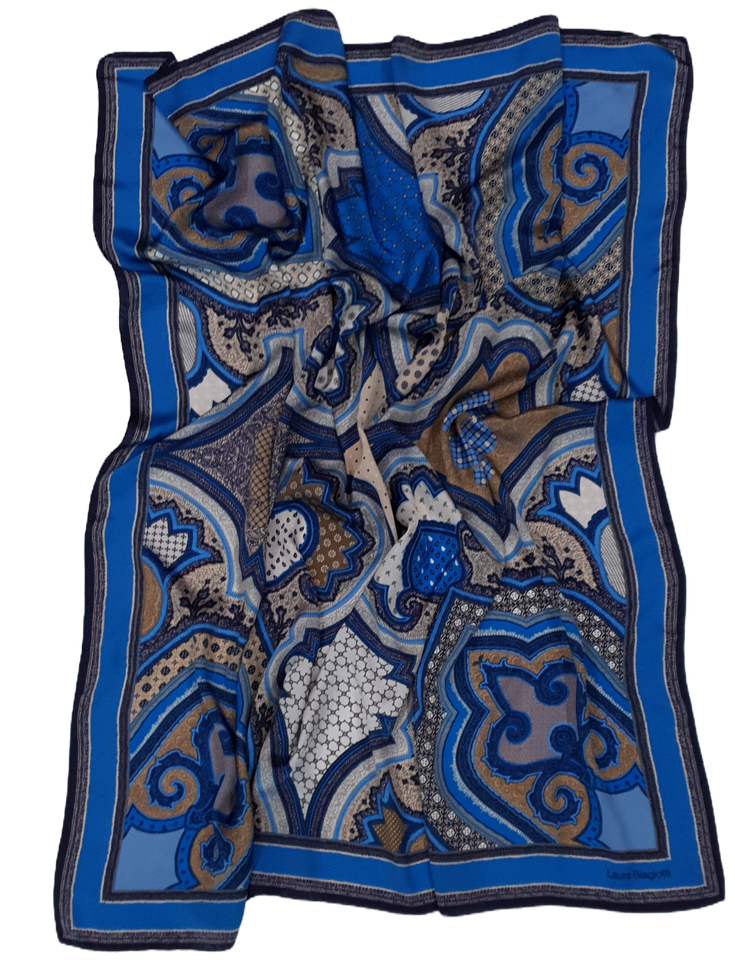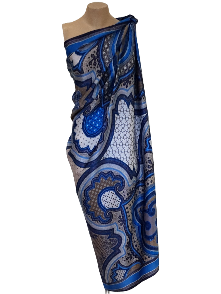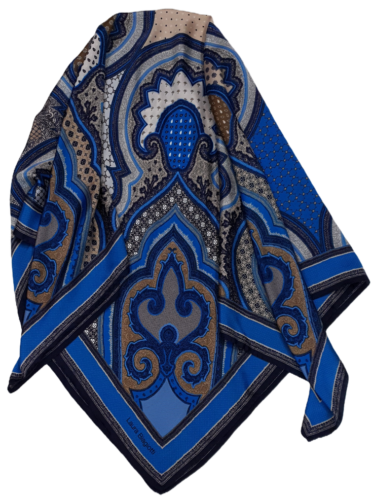 Италиански шал 100% копринен сатен, абстрактен десен шарки тип майолика в синьо, бежово, охра, светло сиво. Елегантен и ефектен аксесоар, подходящ за всяка дреха , може да се носи и като парео. Размерът е 140/140 см.