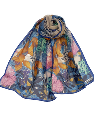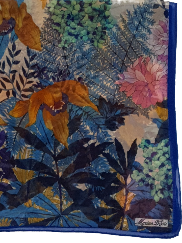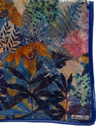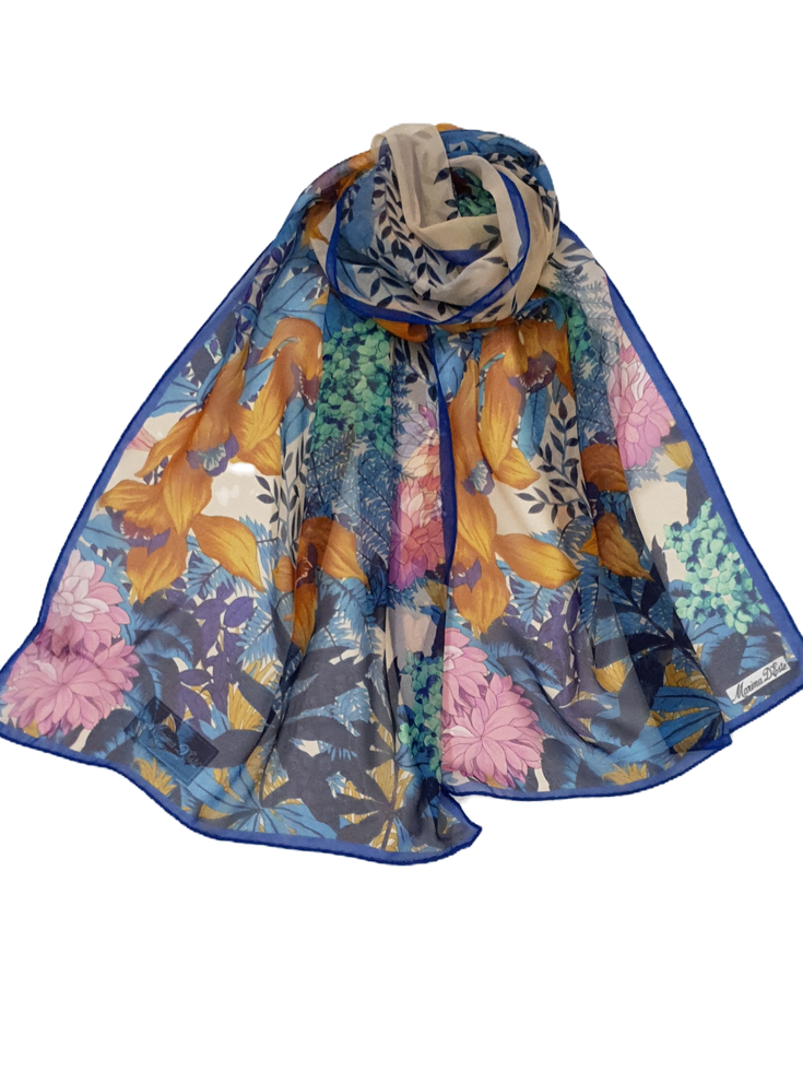 Италиански шал 100% коприна шифон. Флорален десен в нюанси на синьо, жълто, охра, розово, лилаво, екрю и светло зелено. Размерът е 160/45 см . Елегантен и ефирен аксесоар за всяка дреха.