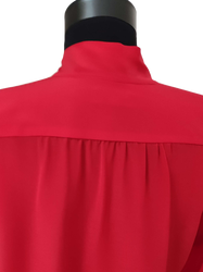 Описание: Блузата е от коприна креп де шин, в наситено червен цвят . Блузата е с платка на рамото и на гърба, с лек набор. Закопчаването е в предната част и завършва с връзка в деколтето. Ръкавите са дълги, широки с маншет.