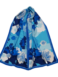 Италиански шал 100% копринен сатен, флорален десен в нюанси на синьо, сребристо сиво, екрю. Елегантен и луксозен аксесоар за всяка дреха. Размерът е 160/45 см.
