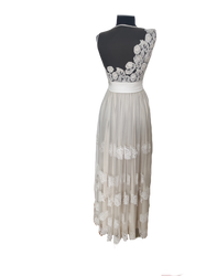 Описание: Рокля рязана в талията, горната част е бяла бродирана дантела с камъни. Деколтето е кръгло с бели камъни. Бюстието е с асиметричен гол гръб. Полата на роклята е от тюл, набран в талията и завършващ с цветя от бродирана дантела.