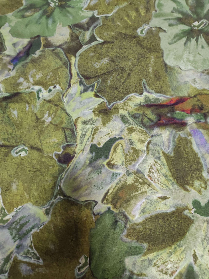 Прекрасен вълнен жоржет, в наситени тоналности на грахово и тютюнево зеленото, с флорален принт.