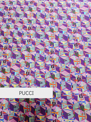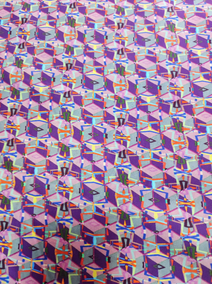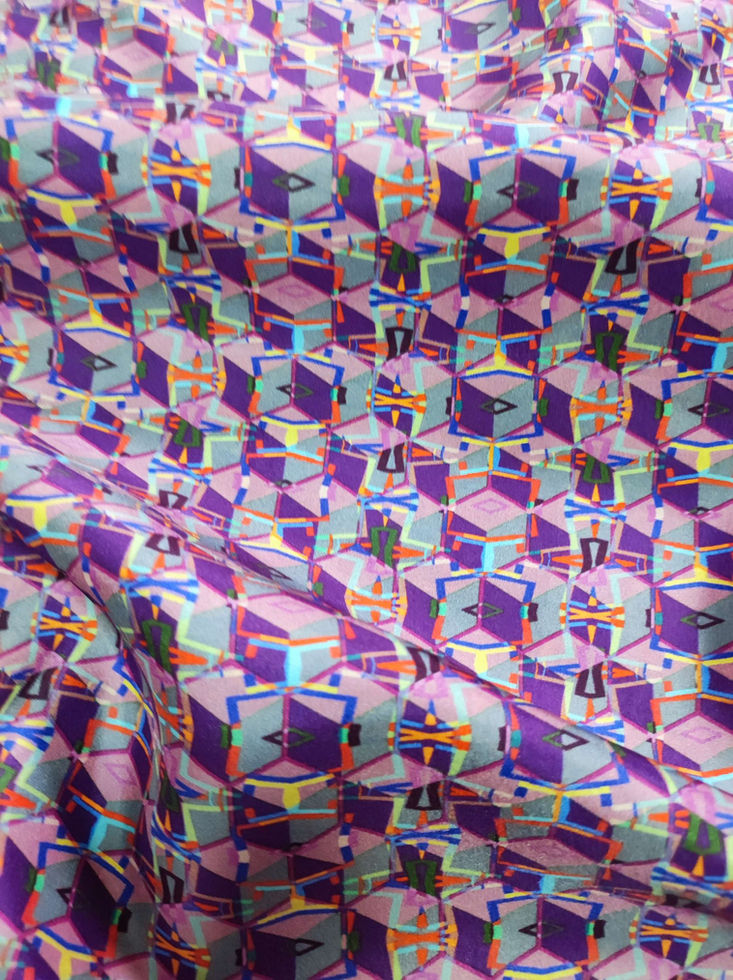 Цветът на коприната е лилав с дребни геометрични фигури в светло лилаво и сиво .
