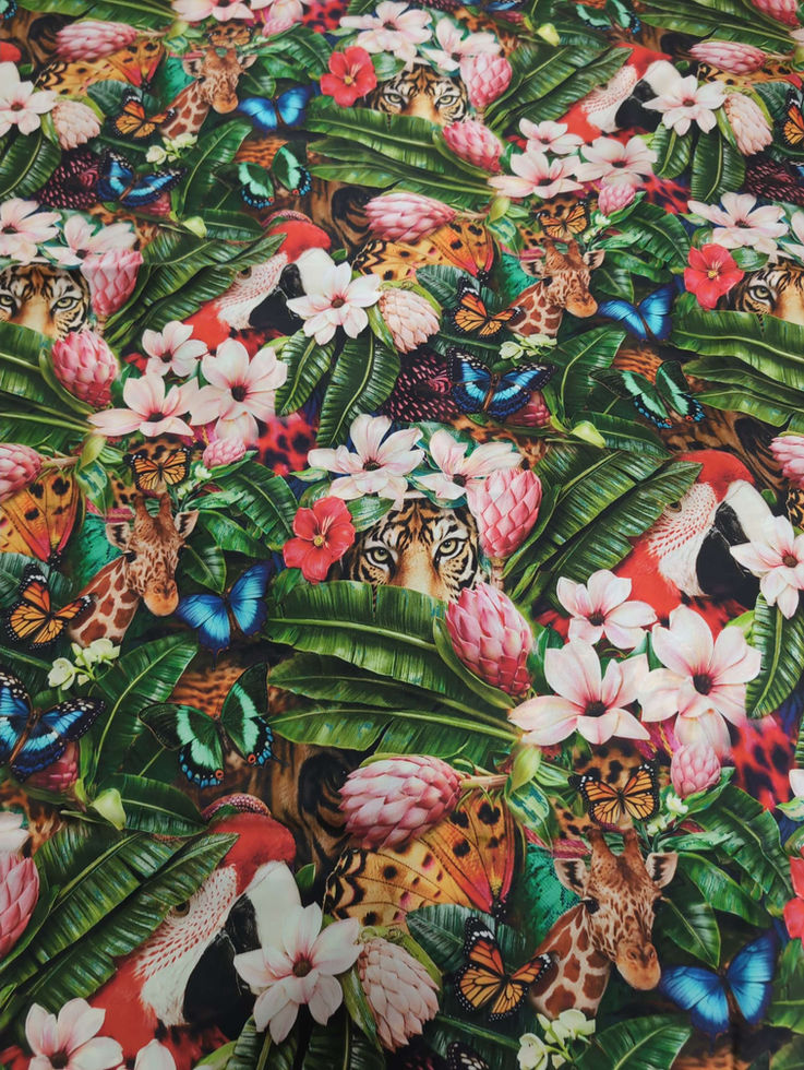 Копринатата е сатенирана от вътршната страна, в ярки цветове, на цветя, пеперуди, лиани, джунгла.