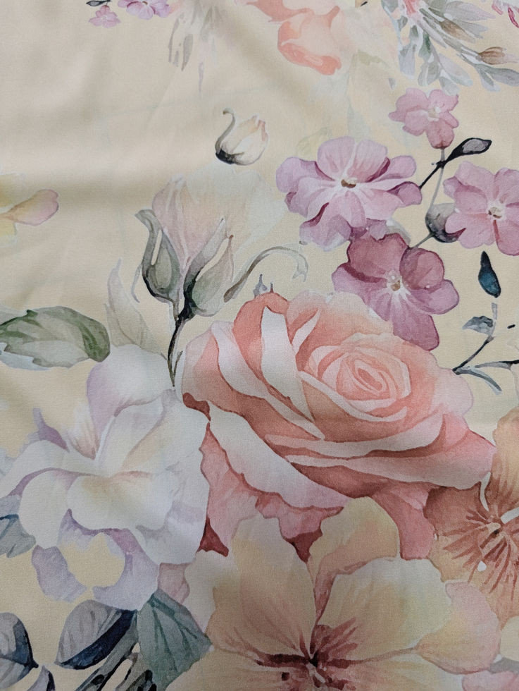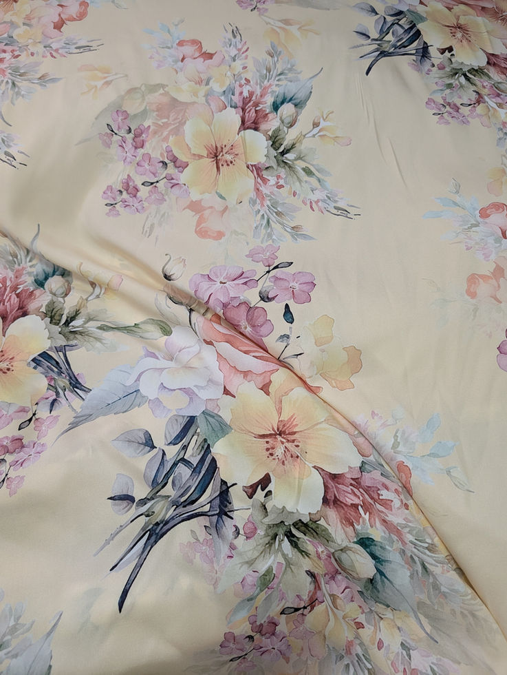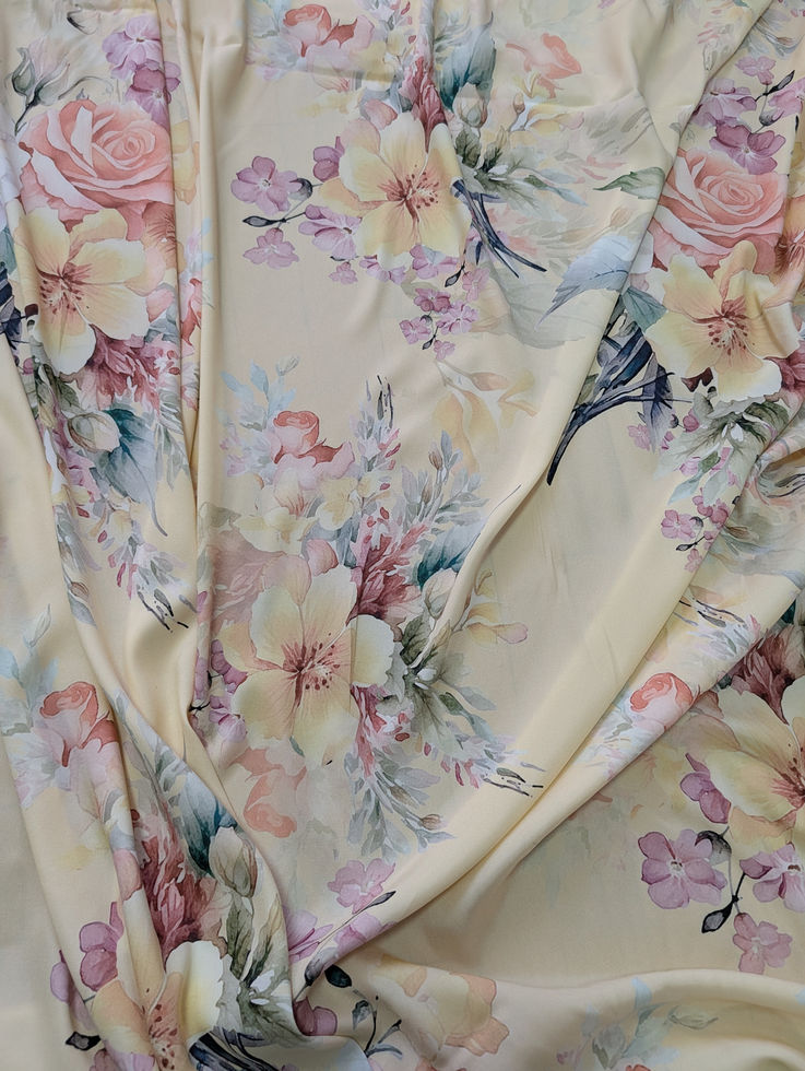 Прекрасен ластичен плат в пастелна тоналност на пясъчно жълто, на букети от цветя.