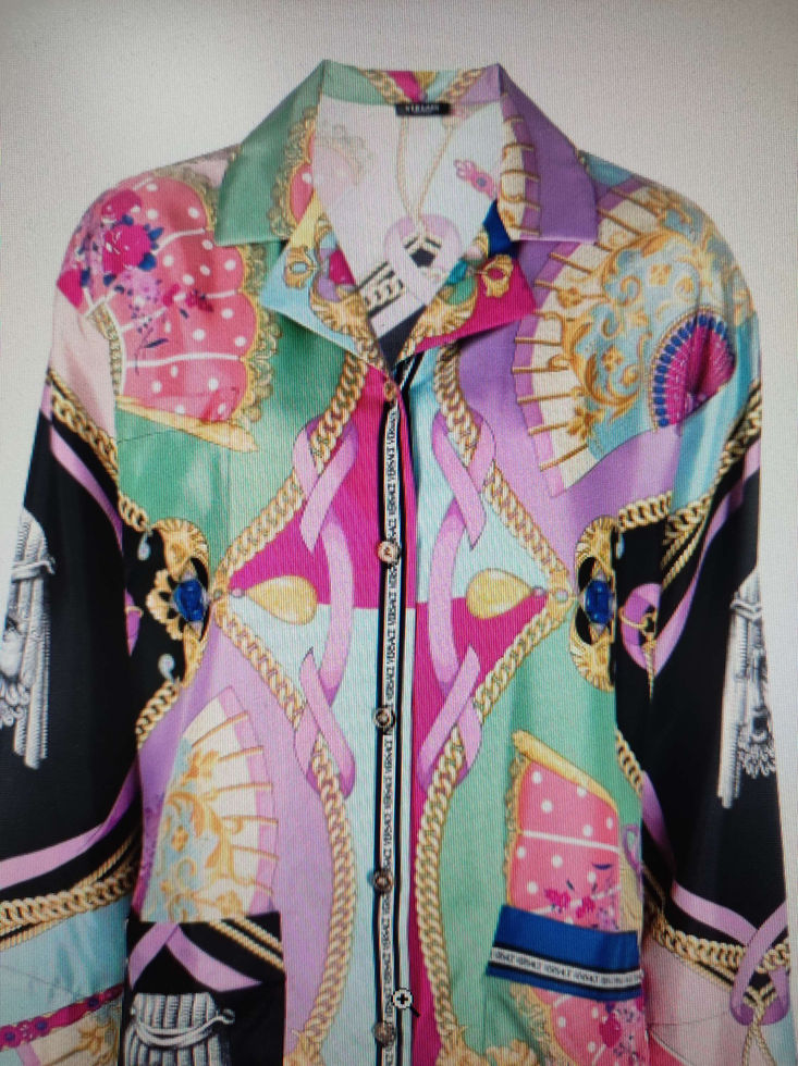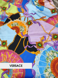 Ластична естествена коприна, лицето е сатен . Десенът е абстрактен, на вериги, златни въжета и японски ветрила.