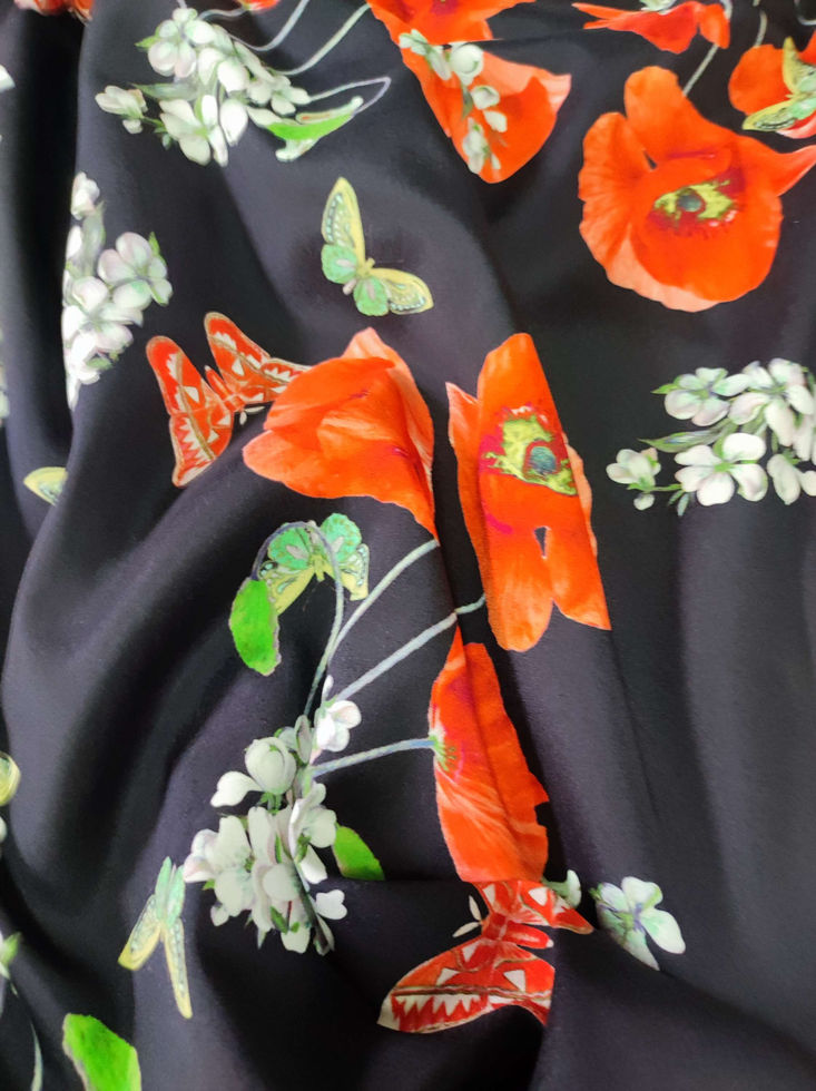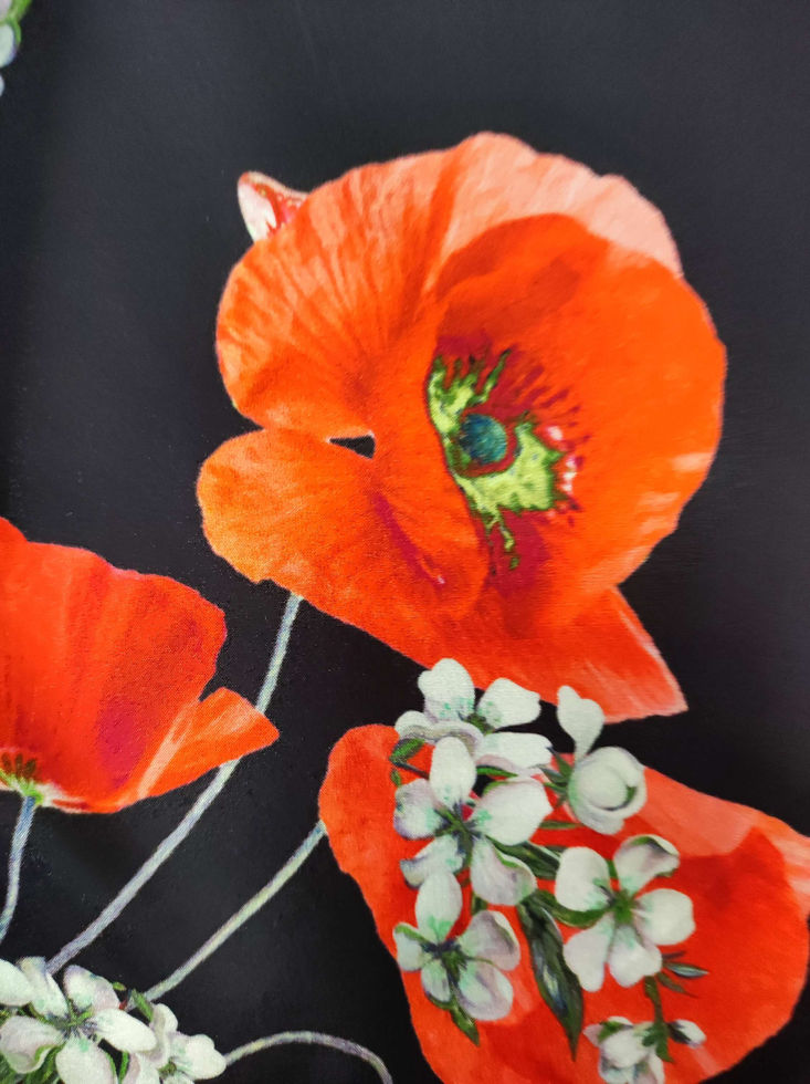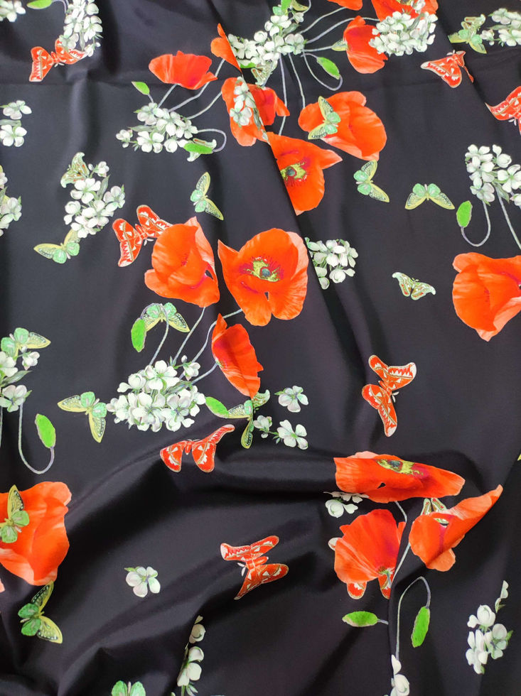 Цветът на коприната е черен на ярко червени макове, пеперуди и цветя..