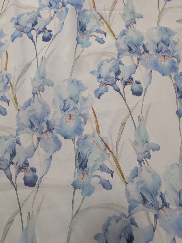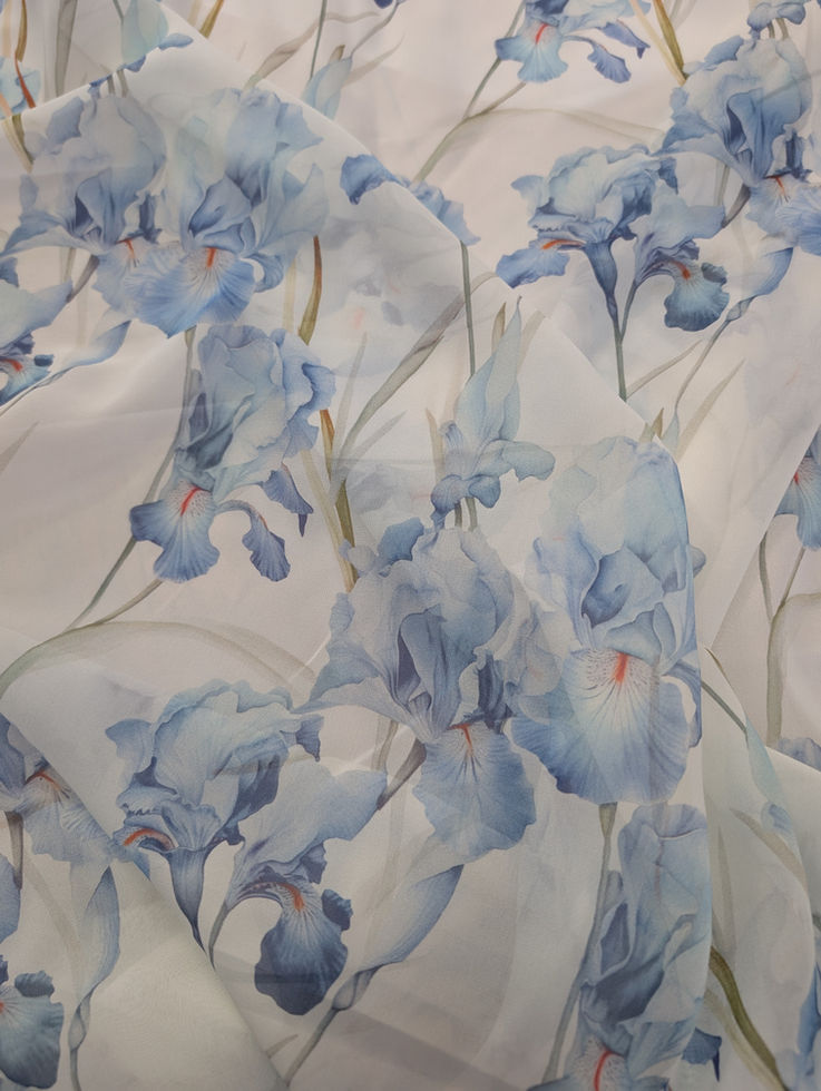 Копринен шифон, лек и въздушен, на бял фон сини ириси.