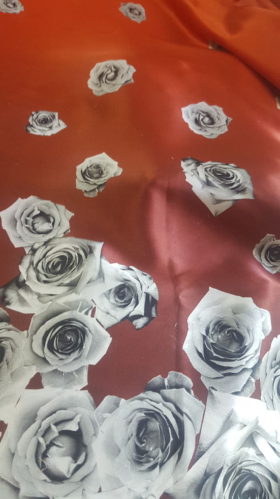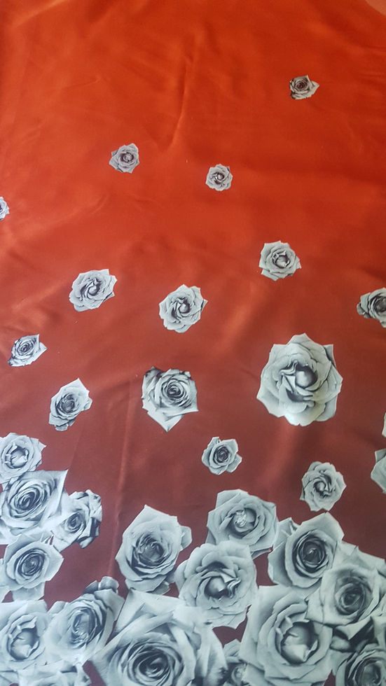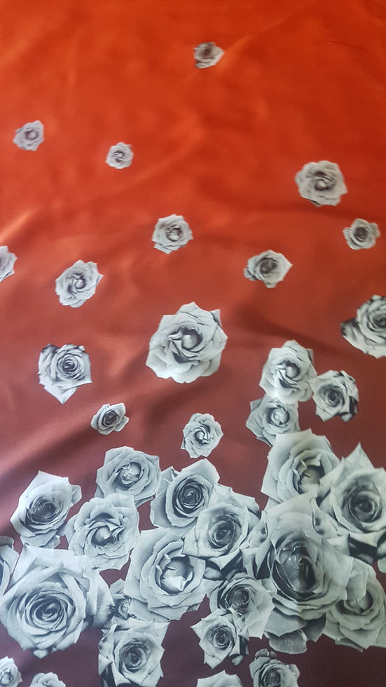 Коприна със сатен лице,в преливащи тонове от оранжево червено до бордо. Завършва с бордюр от сиви рози.