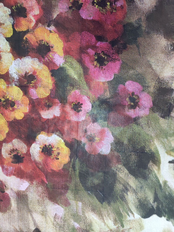 цветя.Цветовете са на бледо жълт фон кафяви, зелени, оранжеви, бордо цветя и листа.
