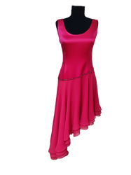 Описание: Роклята е изпълнена от естествена сатенирана, ластична коприна в горната част с лице сатен и дълбоко деколте на гърба. Роклята е асимитрична с три пълни веревни волана от копринен шифон в долната част на дрехата. Много е ефирна, лека и въздушна. Подходяща за бал, сватба, парти.
