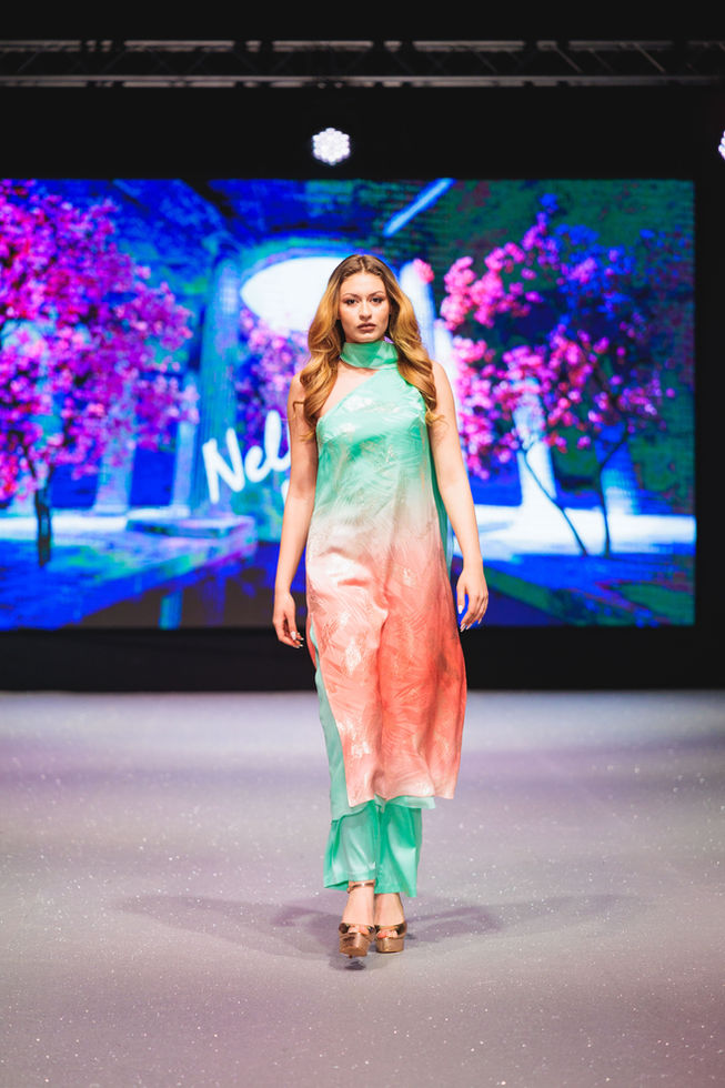 Горната рокля е в преливащи се цветове от синьо зелено към корал,със златен лурекс. Долната рокля е от копринен синьо зелен шифон и изпълнява ролята на хастар.