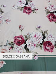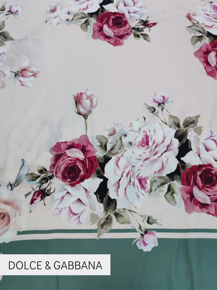 Лицето на коприната е пастелно, а вътрешната страна е сатен. Десенът е флорален, на бледо розов фон рози в розово и бордо. Платът е на панели с дължина 1.35м и завършва с бордюр в пастелно зелено цвят маслина.