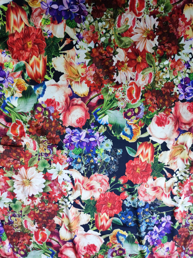 Сатенирана ластична коприна с лице сатен на червени, бели, лилави цветя.