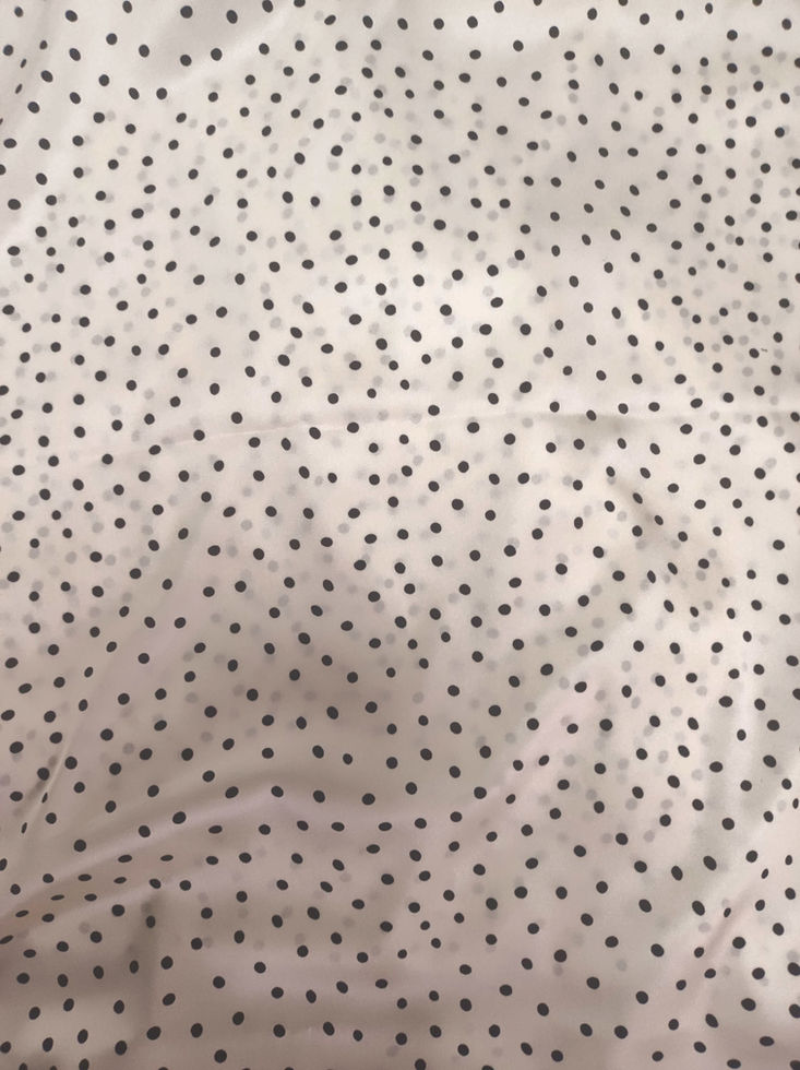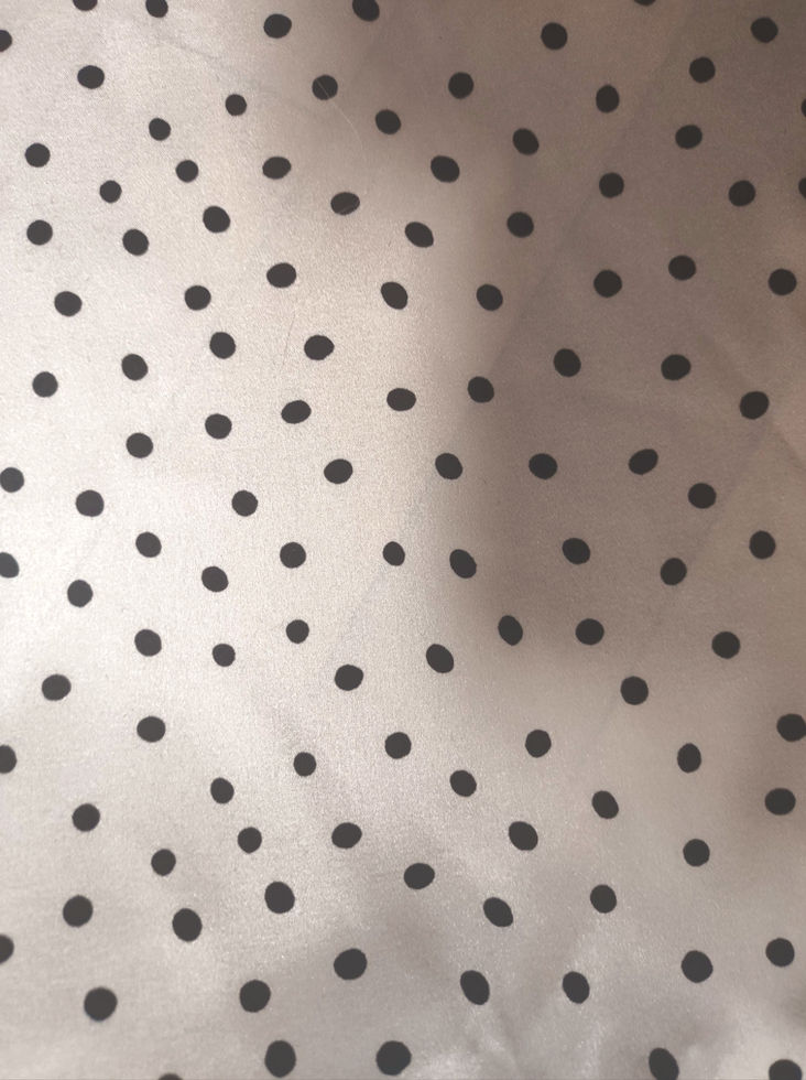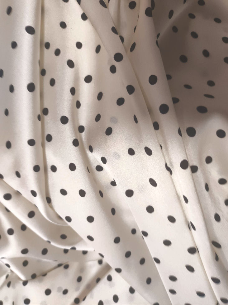 Ластична коприна в цвят шампанско на черни точки, със сатен лице.