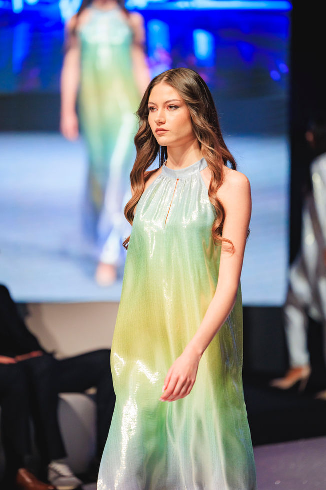 Описание: Елегантна рокля от два пласта естествена коприна, преливащи се цветове от лилаво към светло зелена мента, с американско деколте, лек набор и свободно падащ солует. Горната рокля е с високи цепки отстрани, като плата е с "воден ефект".