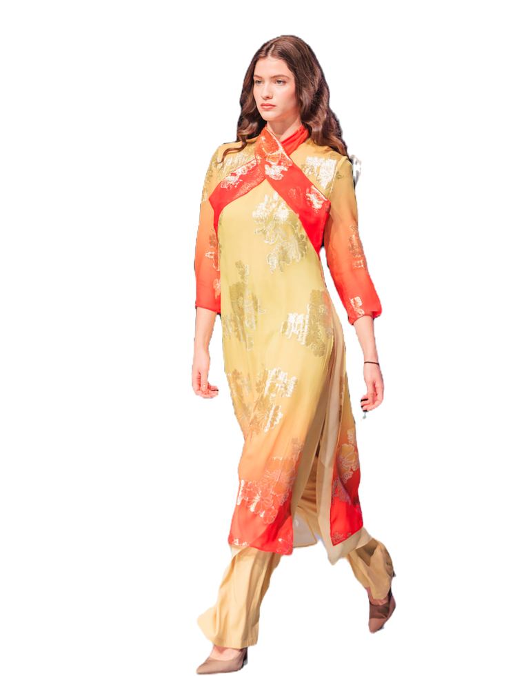 Описание: Роклята/ туника/ е от естествена коприна шифон в преливащи цветове от жълто към огнено червено със цветя от златен лурекс , с дълбоки цепки. Втора рокля от естествена коприна шифон изпълнява ролята на хастар.