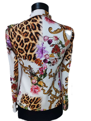 Описание:Сакото е вталено, с хастар, с ревер, едноредно закопчаване.Изпълнено е от ластичен памук. Десенът е на бял фон лилави цветя и тигрови орнаменти.