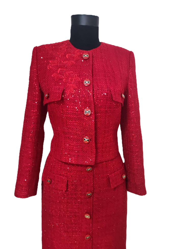 Описание: Костюмът е изпълнен от плътен червен вълнен плат на дребни паети и се състои от късо сако и пола. Полате е трапецовидна с цип на гърба. Сакото е късо и вталено със закопчаване,с декоративни джобове и вградена дантела в едното рамо.