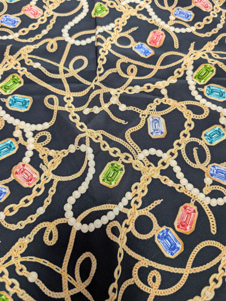 Непрозрачна естествена коприна креп де шин , на черен фон перли и златни бижута.