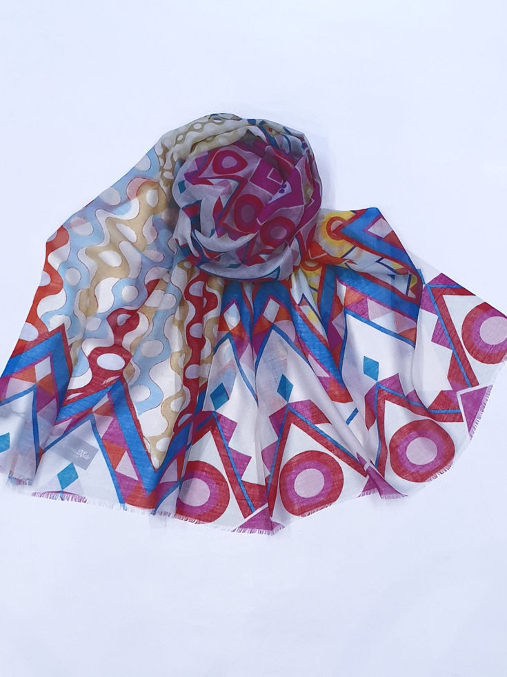 Италиански шал 50% кашмир, 30% вълна, 20% коприна с размер 180/70 см. Десенът е геометрични фигури в бяло, тъмно розово, синьо, червено, жълто, оранжево .Ефектен, мек и топъл аксесоар, подходящ за всяка дреха .