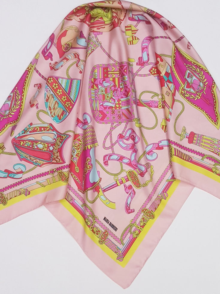 Италиански шал 100% сатенирана коприна. Фонът е светло розов с орнаменти в жълто, червено, светло сиво, цикламено, бледо оранжево. Размерът е 120/120 см. Луксозен аксесоар и приятен за носене.
