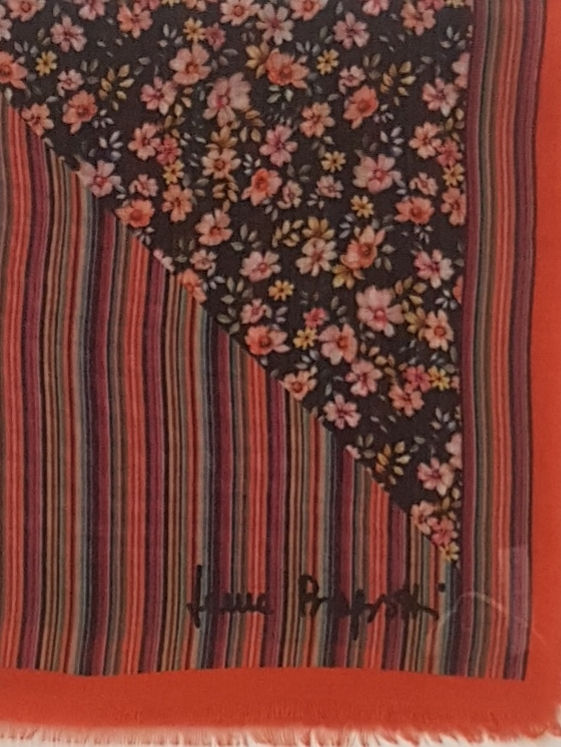 Италиански шал 15% коприна/ 85% модал с размер 140/140см в оранжево ,цикламено, петролено, черно и синьо с флорален принт тип пачуърк. Подхадящ за всяка дреха.