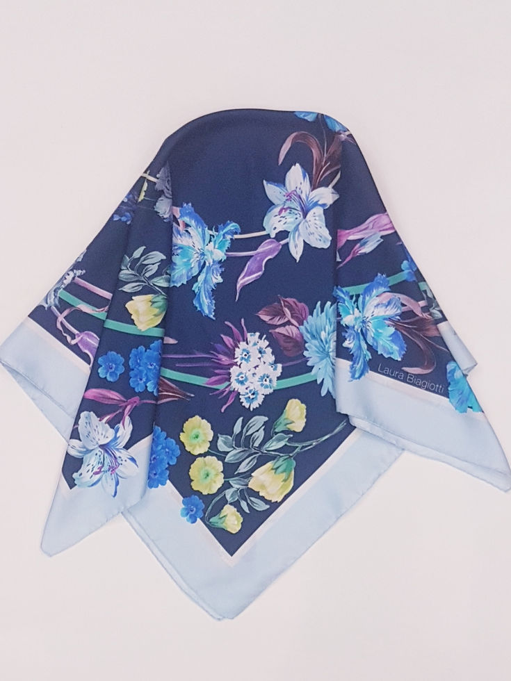 Италиански шал 100% копринен сатен, флорален десен на тъмно син фон цветя в розово, бледо лила, синьо, зелено, екрю, кафяво завършащ със светло син кант. Елегантен и ефектен аксесоар, подходящ за всяка дреха. Размерът е 90/90 см.