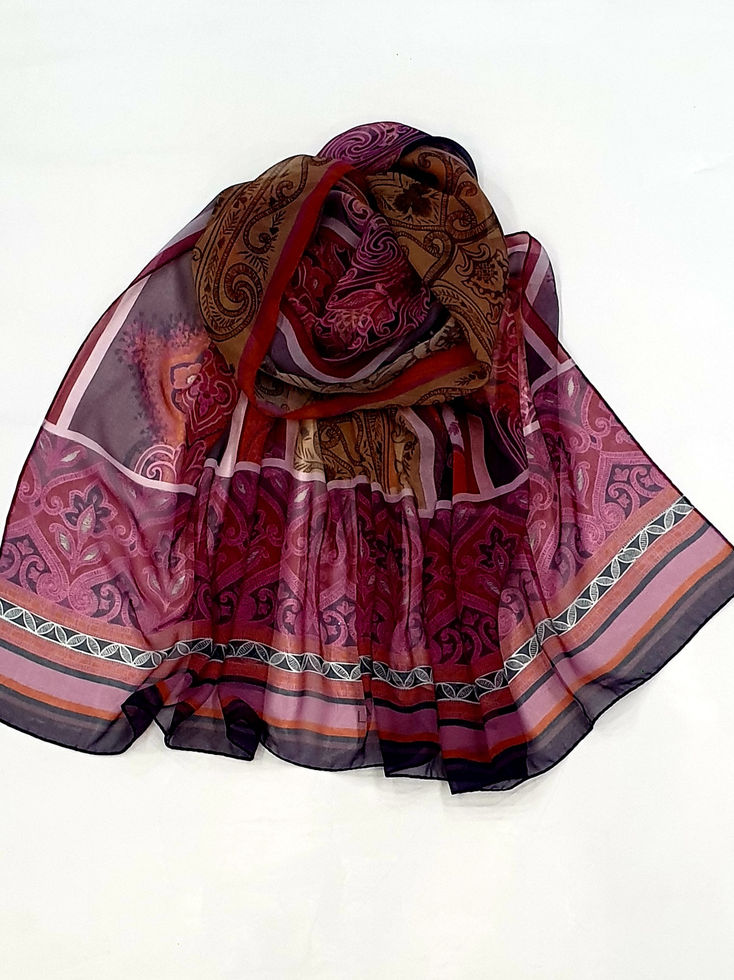 Италиански шал 100% коприна шифон. Цветовете са лилаво, цикламено, оранжево, светло розово, бежаво с флорален десен и орнаменти. Размерът е 180/70 см. Мек и ефектен аксесоар за всеки тоалет.