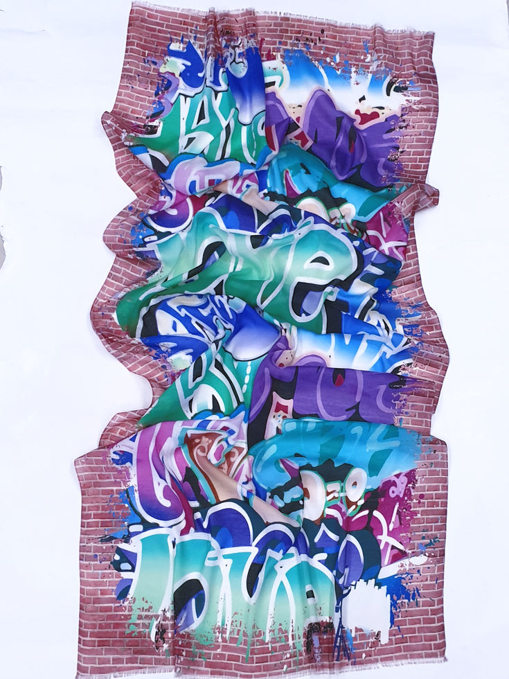 Италиански шал 100% модал,с абстрактен принт в синьо, зелено, лилаво, кафява гама. Размерът е 190/80 см.