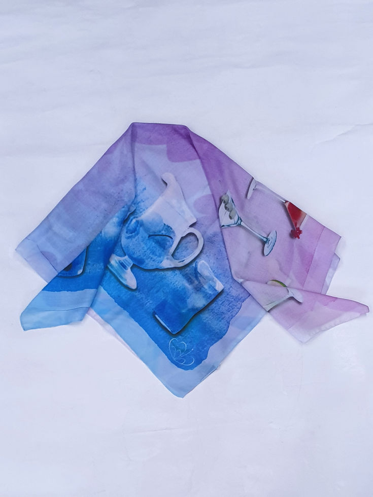 Италиански квадратен шал 100% модал,с размер 80/80см, в синьо,лилава гама и закачлив принт коктейли.