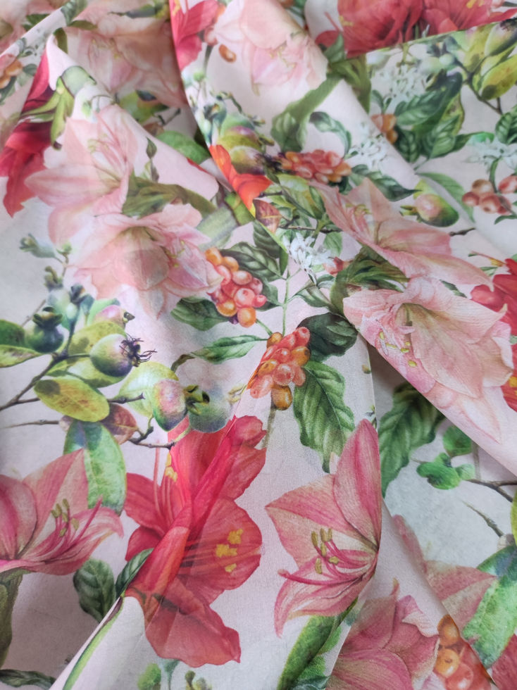 Копринен шифон в светло и пастелно розово на малки цветя в червено, коралово със зелени клонки.